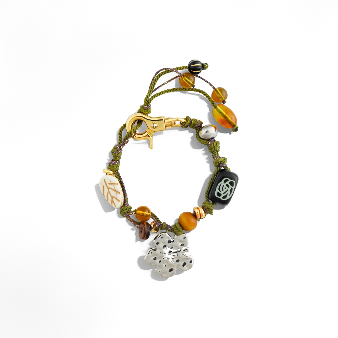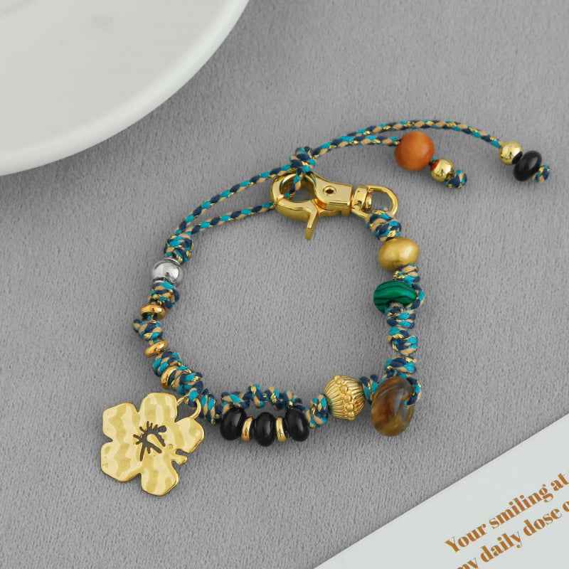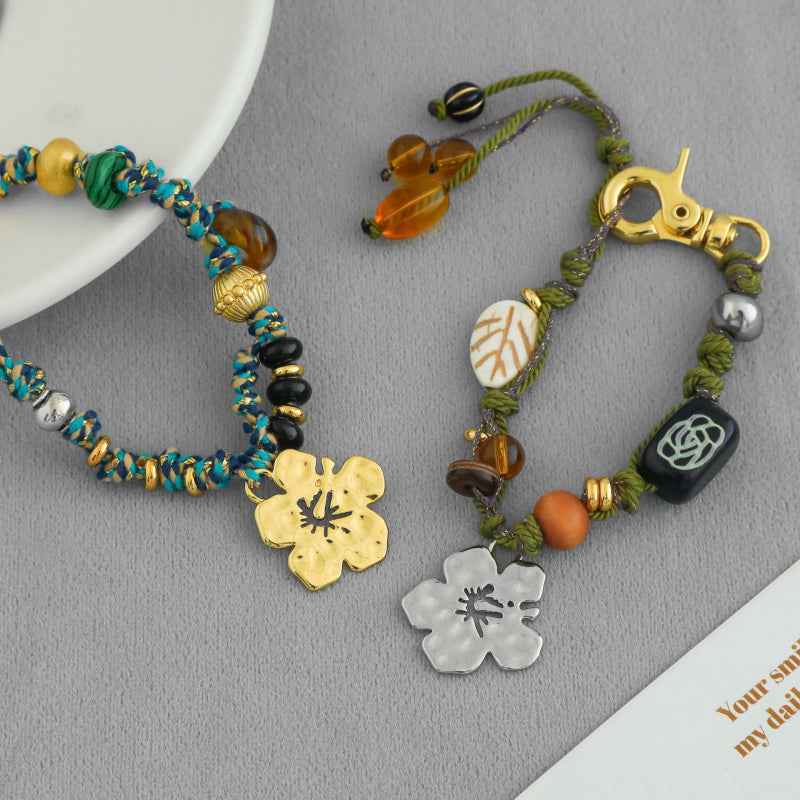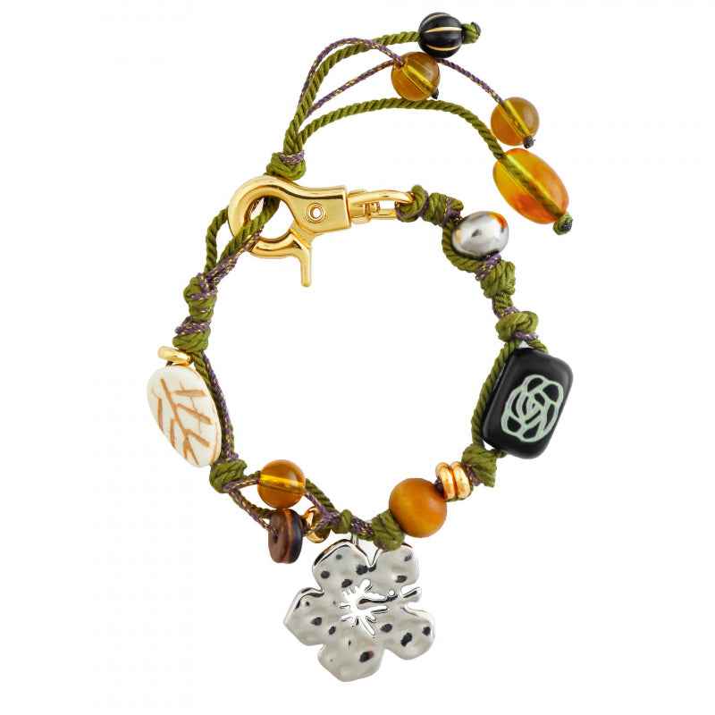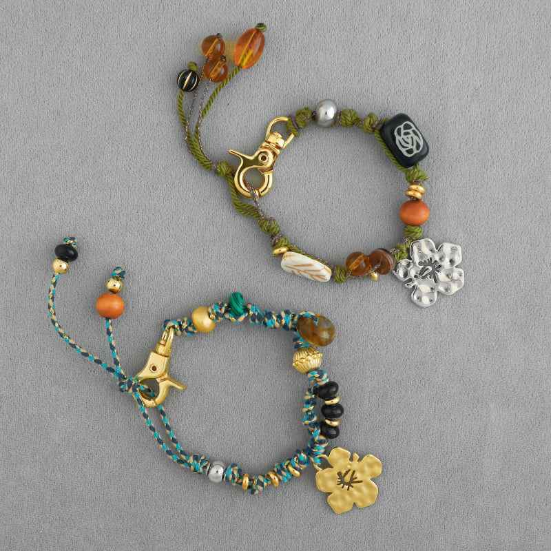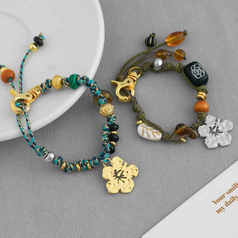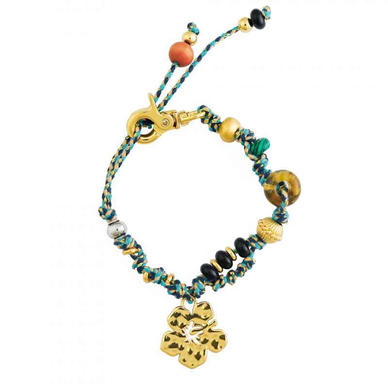سوار مضفر مصنوع يدويًا مع سحر الكركديه وزخارف من الخرز. نحاس مطلي بالكهرباء باللون الذهبي الدافئ أو الفضي. قابل للتعديل للارتداء اليومي أو التكديس - نمط نابض بالحياة مستوحى من الجزيرة.